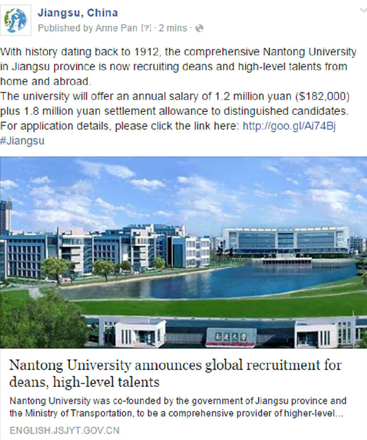 2月4日,中共江苏省委分别在其Facebook和Twitter的官方账号Jiangsu China中推出mg冰球官网面向全球高薪招聘高层次人才的信息。