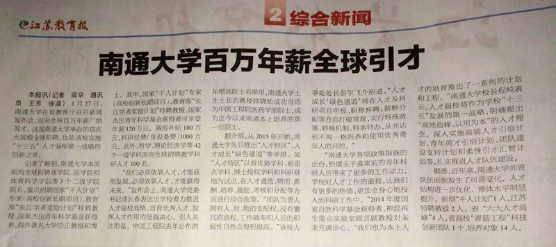 又讯 2月3日出版的《江苏教育报》,在二版头条位置刊登了题为《mg冰球突破试玩百万年薪全球引才》的文章,介绍了mg冰球官网高层次人才招聘的信息,以及近年来mg冰球官网人才工作相关举措以及取得的成绩。