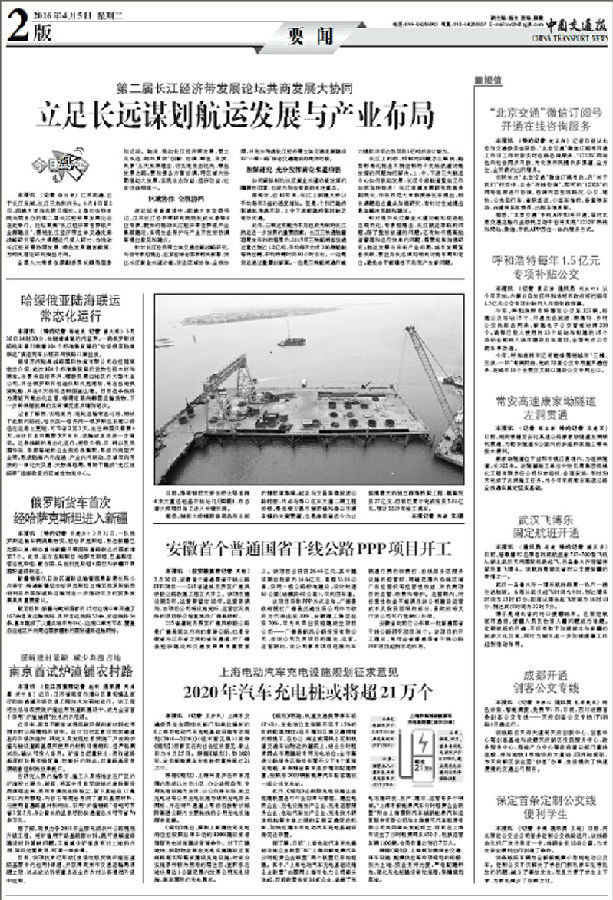 4月5日出版的中国交通报在二版头条位置刊登题为《立足长远谋划航运发展与布局——第二届长江经济带发展论坛共商发展大协同》的新闻,报道了第二届长江经济带发展论坛。