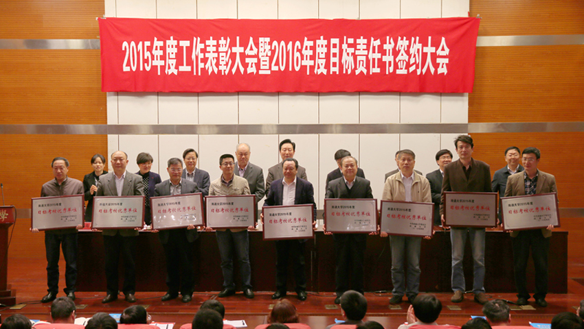 4月25日,mg冰球官网召开2015年度工作表彰大会暨2016年度目标责任书签约大会,回顾总结2015年度目标管理工作情况、表彰先进、签订2016年度目标责任书。校党委书记成长春、校长程纯分别就做好2016年度目标管理工作提出具体要求:凝聚共识、狠抓落实、多措并举,不断完善目标管理长效机制,努力实现学校“谋划十三五、开启新百年”的良好开局。校党委副书记、纪委书记彭怀祖主持大会。