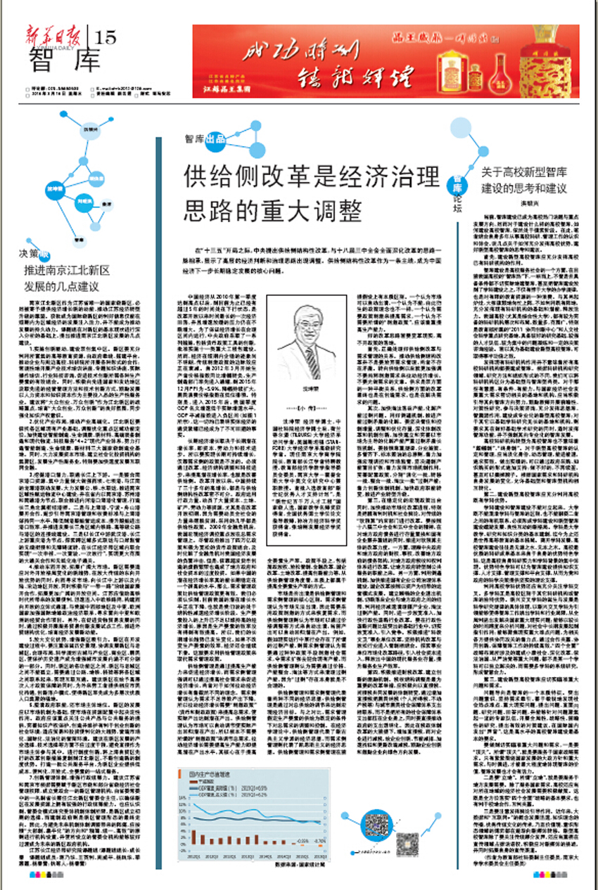 近日出版的新华日报在智库版,以《推进南京江北新区发展的几点建议》为题,刊登了mg冰球官网江苏长江经济带研究院课题组在深入分析南京江北新区基本现状的基础上,从实施创新驱动,建设双创集中区;优化产业布局,推动产业高端化;挖掘港口潜力,联通长江上下游;推动东西开放,拓展广阔大市场;放大文化优势,增强新区吸引力;厘清政府职能,还市场主体地位;创新管理体制,增强行政统筹力等七个方面对推进新区发展提出的建议。