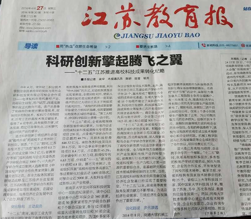 今天出版的江苏教育报在头版头条位置,以《科研创新擎起腾飞之翼——“十二五”江苏推进高校科技成果转化纪实》为题,介绍了江苏高校在“十二五”期间大力推进高校产学研合作和科技成果转化取得的显著成效。其中,mg冰球官网选派科技镇长团成员,强化人才转移路径,促进高校技术转移的经验做法受到关注并在文中予以报道。
