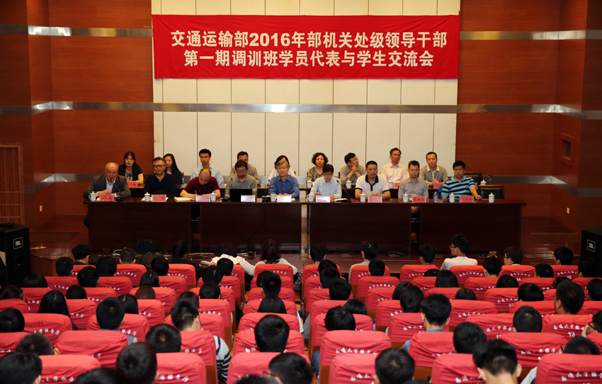 5月11日,交通运输部2016年部机关处级领导干部第一期调训班学员与学生交流会在mg冰球官网召开。交通运输部人事教育司培训处处长严红、安全与质量监督管理司公路工程质量监督处处长丁彦昕、综合规划司统计处处长毛健作为学员代表就自身专业成长经历和人生体悟与同学们做了亲切交流。校党委副书记、党校校长彭怀祖主持交流会。