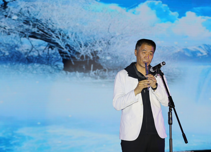 交通运输部离退休干部局东城离退休干部工作处副处长赵振涛表演哨笛独奏《寒江雪》。