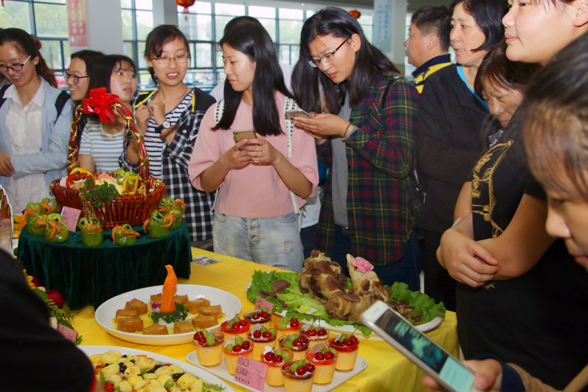 来自各校区食堂的32名选手参加了此次比赛。比赛分白案组和红案组,选手在规定时间内完成指定菜和自选菜制作,以切合大学生日常饮食习惯的食材为主,共制作出一百余道菜品,既有南通地方特色菜,还有精心研制的创新菜,热菜、冷拼、面点,烹炒煎炸蒸不一而足。半透明的凝膏里清晰可见暗藏的颗颗红豆;糯米团子点缀上黑芝麻,制成熊猫的憨态模样;新西兰三色牛奶蛋糕上装饰着艳红樱桃;菠萝汁、西瓜汁、红豆奶昔……各个展台前挤满了观赏和品尝的师生。惟妙惟肖形状拼盘,精致可口的菜肴,引得师生连连拍照,竞相品尝,为在场师生奉献出视觉与味觉的饕餮盛宴。评委们从刀工、成型、火候、色泽、口味等方面分别点评。经过评比,熊军成、俞国建获红案组一等奖,李翔获白案组一等奖。主校区西食堂获最佳展台奖,主校区东食堂获团体最佳拼搏奖,钟秀校区食堂获最佳组织奖。