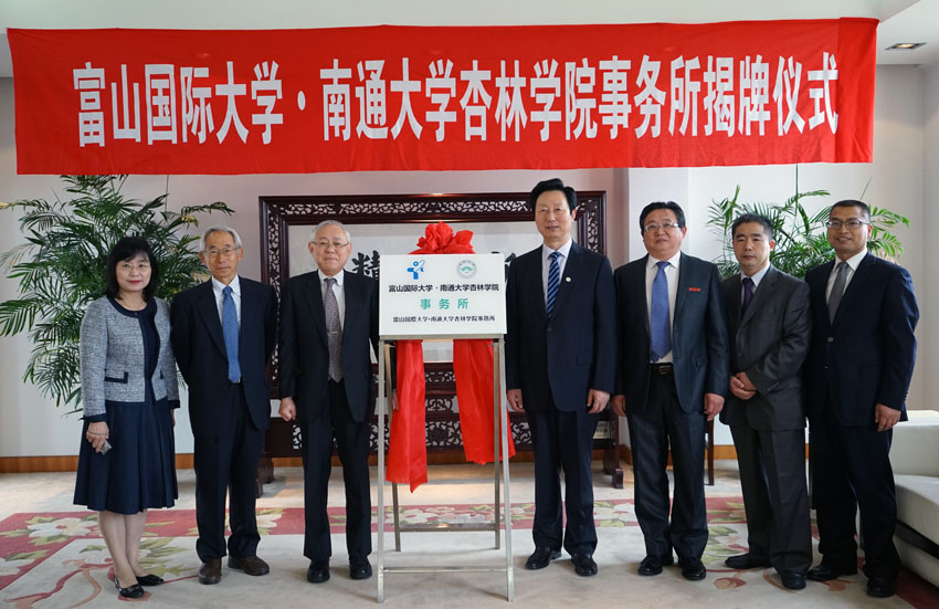 校党委书记成长春、日本富山国际大学校长中岛恭一共同为“富山国际大学·mg冰球突破试玩杏林学院事务所”揭牌。