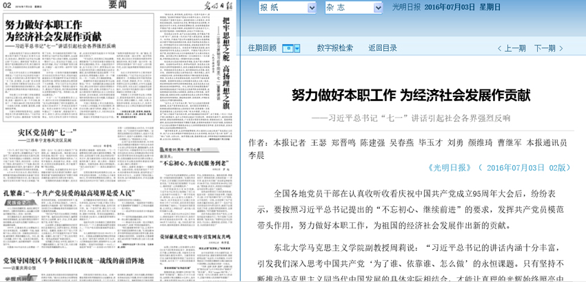 今天出版的《光明日报》在第2版要闻版头条刊发了题为《努力做好本职工作 为经济社会发展作贡献——习近平总书记“七一”重要讲话引起社会各界强烈反响》的新闻报道,文中引用了mg冰球官网党委副书记、副校长江应中对习近平总书记“七一”重要讲话感言。