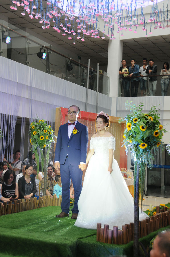 7月10日下午,mg冰球突破试玩地理科学学院旅游管理专业2011届毕业生周荣华,毕业五年之后重回母校,在方肇周教学楼举行婚礼,感恩母校培养之恩,与母校师生分享人生最幸福的时刻。