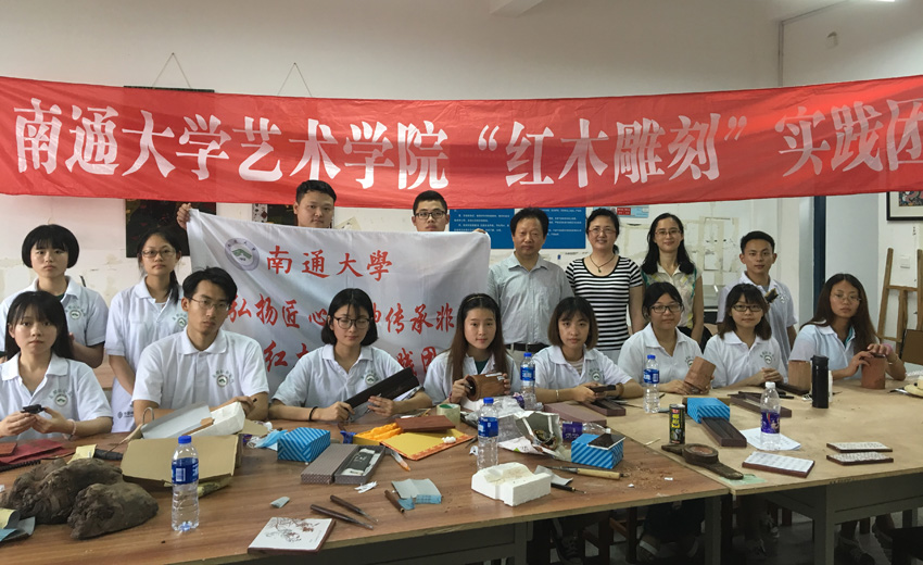 “全国红木看江苏,江苏红木看南通。”南通是全国红木家具生产重地,作为非物质文化遗产的红木雕刻在南通也是久负盛名。红木雕刻实践小队于6月29日赴淘宝城门店内参观红木雕刻作品,并受南通非遗传人高爱华老师指导进行现场雕刻。学院党委副书记王德宽高度赞赏了成员雕刻的蝉、笔筒、镇纸等红木雕刻作品,并对团队实践活动提出了期望,要领会精益求精、一丝不苟、专注坚持的匠心精神,传承、发展和创新南通非物质文化遗产。