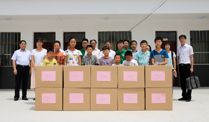 校党委副书记、副校长江应中代表学校向吕滩村低收入农户捐赠十箱生活用品。