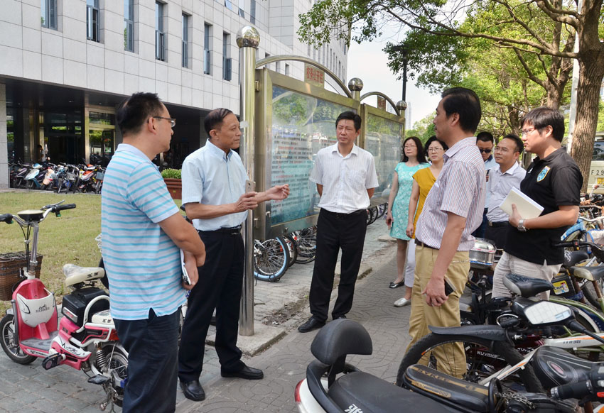 从主校区开始,江应中一行边走边看,发现问题不时停下来详细了解情况、督促整改。学生宿舍区、校内河道旁等容易被忽略的地方,江应中都十分关注,对出现的自行车停放无序、校外广告乱张贴、建筑垃圾整理不到位等问题一一提出整治意见。