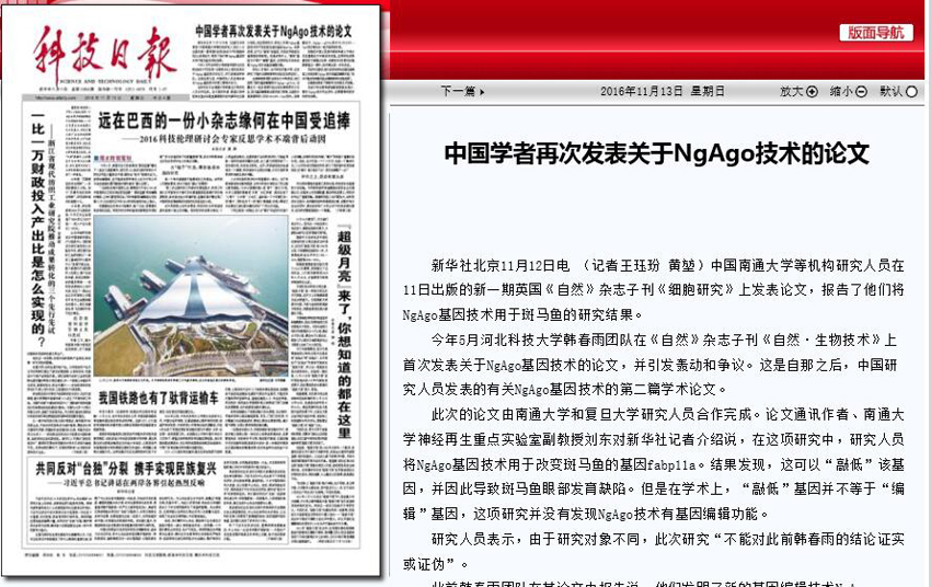 据媒体报道,刘东课题组在11月11日出版的新一期《细胞研究》杂志上发表论文,报告了他们将NgAgo基因技术用于斑马鱼的研究结果。