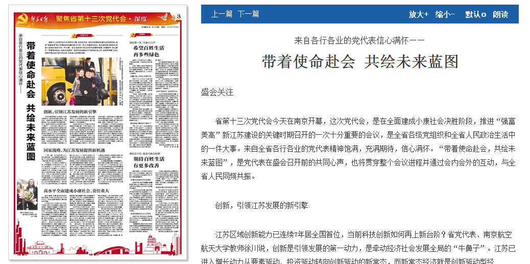 11月18日出版的《新华日报》在第三版“聚焦省第十三次党代会”专版刊发题为《带着使命赴会 共绘未来蓝图》的文章,其中刊发了省第十三次党代会代表、校党委书记成长春对江苏发展的观点建议。