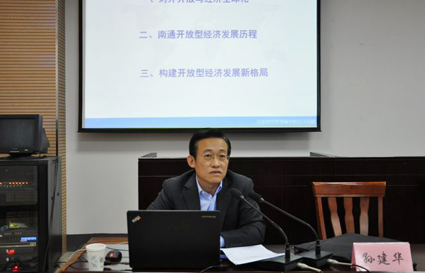 随后,孙建华教授为管理学院师生作了题为“南通开放型经济发展中的几个问题”的学术报告。孙建华介绍了“对外开放与经济全球化的一般理论”、回顾了“南通开放型经济发展历程”,提出了“构建南通开放型经济发展新格局”的若干思考。孙建华教授的报告视野开阔、内容丰富、数据翔实、语言生动形象,加深了管理学院师生对南通市当下经济发展形势的了解与认识。