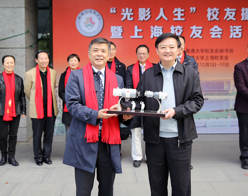 上海航天科学技术开发有限公司常务副总经理、上海校友会副秘书长沈杰向母校赠送“神舟十一号与天宫二号对接模型”。