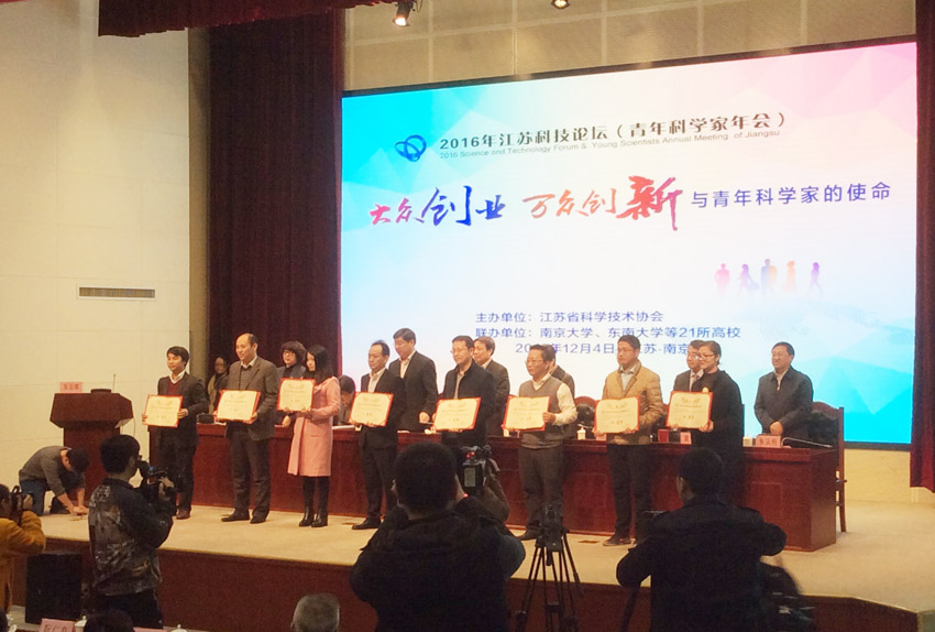 12月4日,2016年江苏省科技论坛(青年科学家年会)在江苏省科技工作者活动中心举行。开幕式上颁发了首届江苏省科协青年会员创新创业大赛奖项。由mg冰球官网科协推荐,化学化工学院朱鹏副教授主持的《高效晶体硅太阳能电极材料》项目喜获二等奖。