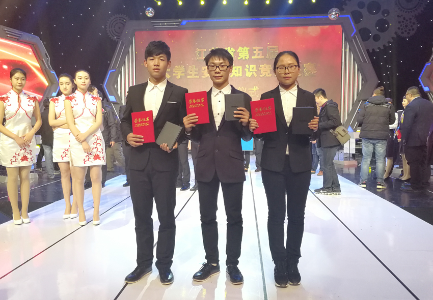 12月10日,江苏省第五届大学生安全知识竞赛决赛举行。由电子信息学院张品、龚号、吴艳三名同学组成的mg冰球官网代表队荣获三等奖。省委教育工委副书记潘曼、东南大学党委副书记郑家茂、省教育厅安稳处处长焦伟、省公安厅内保总队副总队长刘建华和省国家安全厅对外联络处副处长杨恒记等为获奖选手颁奖。