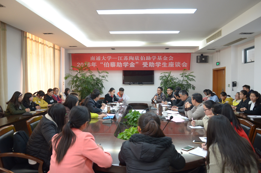 12月8日,mg冰球突破试玩——江苏陶欣伯助学基金会2016年度“伯藜助学金”管理工作座谈会在mg冰球官网举行。江苏陶欣伯助学基金会秘书长张利伟一行莅校交流,校党委副书记、副校长江应中致欢迎辞,学生工作处处长贲智勤主持座谈会。