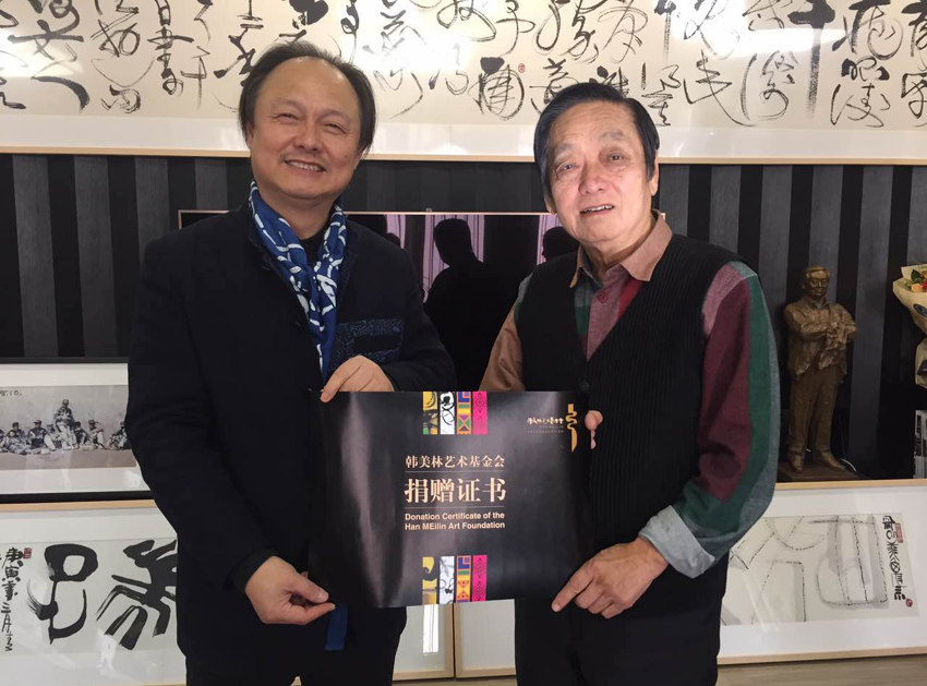 韩美林向吴元新捐赠奖励基金用于收集抢救保护民间古旧蓝印花布。