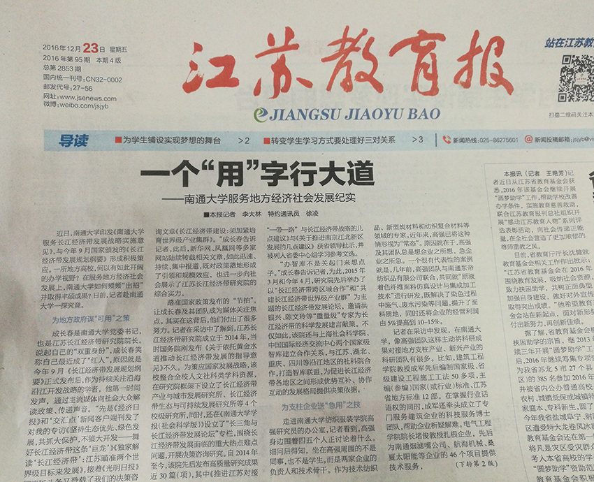 12月23日出版的江苏教育报,在头版头条刊登题为《一个“用”字行大道——mg冰球突破试玩服务地方经济社会发展纪实》的长篇通讯,报道mg冰球官网近年来服务地方工作所取得的成效。
