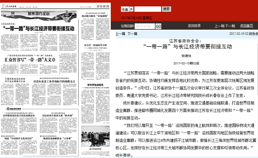 2月7日,江苏政协网全文刊登了成长春委员的大会发言。2月10日出版的《人民政协报》在二版头条以《江苏省政协全会:“一带一路”与长江经济带要衔接互动》为题,在文中引用了成长春委员的主要观点。2月9日出版的《新华日报》全景江苏两会专版以《为打好“两聚一高”主攻仗建诤言献良策》为题,摘登了成长春委员的发言观点。会议期间,成长春还应邀做客新华报业全媒体中心两会特别报道《今天我主持》栏目,就“高铁成环,打造世界级沿江城市群”这一主题回答了记者的提问,2月11日出版的《新华日报》和《扬子晚报》两会专版分别在头条显著位置刊登了这一专访。