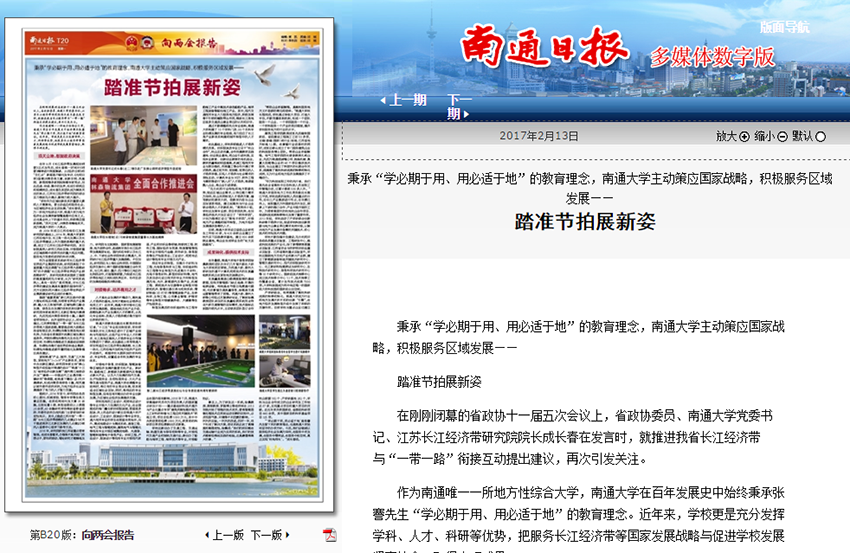 在南通市两会召开之际,2月13日出版的南通日报刊发题为《踏准节拍展新姿》的专版报道,详细介绍mg冰球官网发挥学科、人才、科研等优势,把服务长江经济带等国家发展战略与促进学校发展紧密结合所取得的丰硕成果。