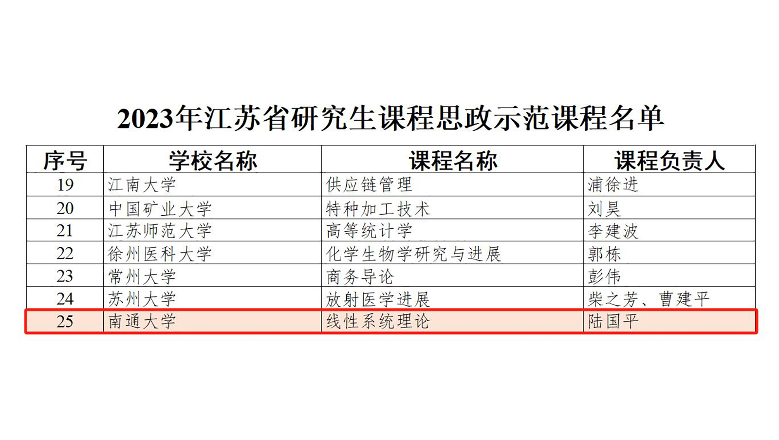 近日,省教育厅公布2023年江苏省研究生课程思政示范课程遴选结果。mg冰球官网陆国平教授教学团队的研究生课程《线性系统理论》获评江苏省研究生课程思政示范课程。