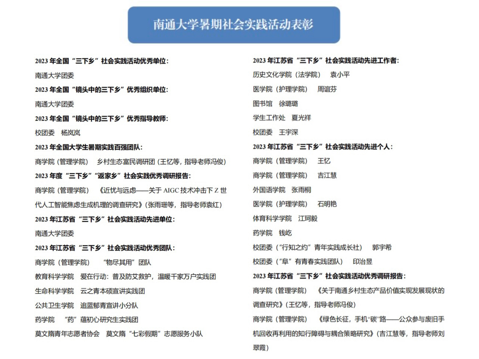 此外,mg冰球官网暑期社会实践工作还获得多项省级荣誉。其中,校团委获2023年江苏省大中专学生志愿者暑期文化科技卫生“三下乡”社会实践活动“先进单位”,“物尽其用”团队等6支团队获省社会实践优秀团队,王宇深等5位老师获评省社会实践“先进工作者”,江珂毅等8位同学获评省社会实践“先进个人”,《关于南通乡村生态产品价值实现发展现状的调查研究》等2篇调研报告获评省社会实践优秀调研报告。
