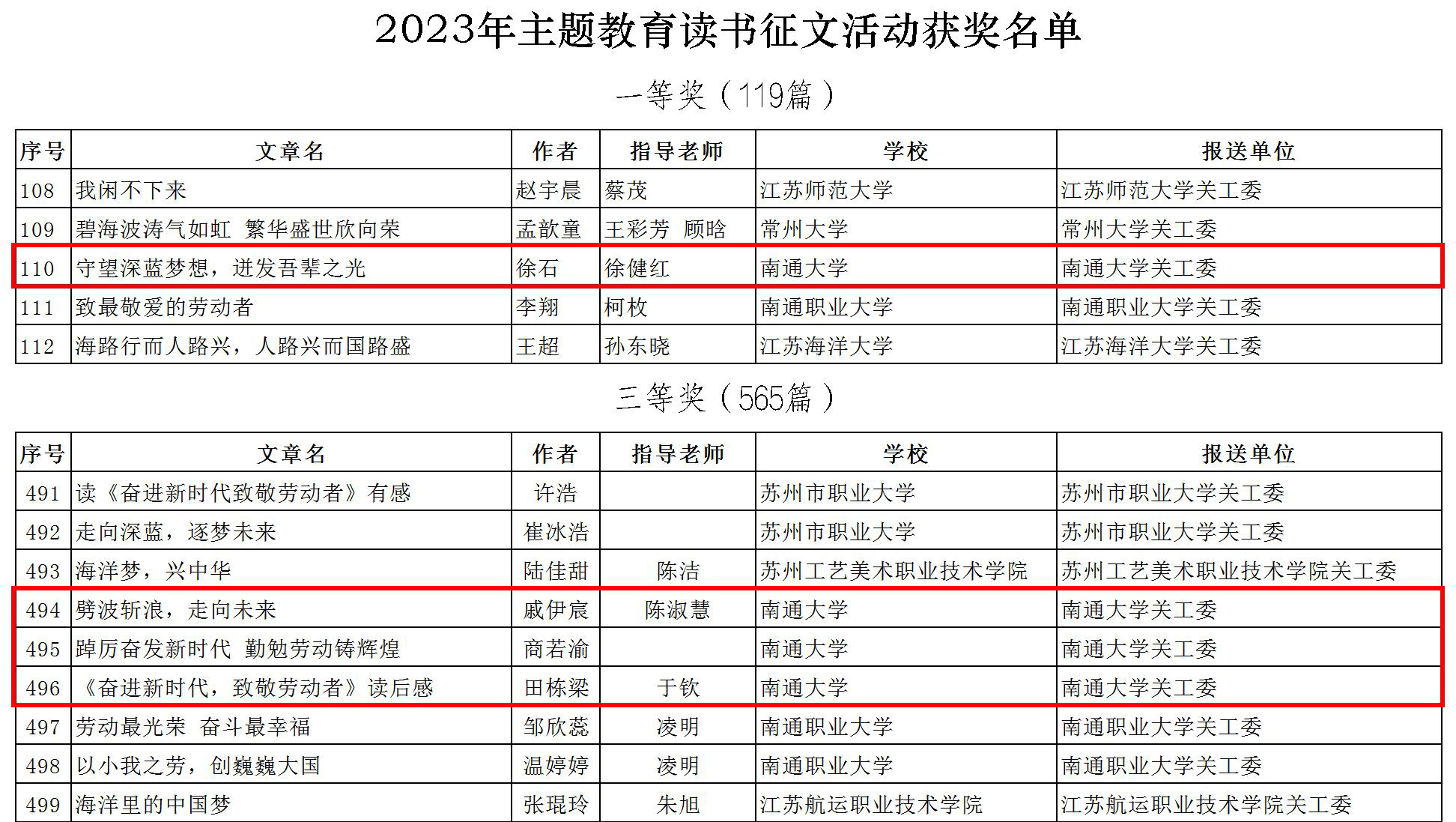 校关工委积极发动各学院关工委开展2023年主题读书征文活动,并购置书籍发放到学院。经学院、学校关工委二级评审,共遴选出20篇征文上报省教育系统关工委。最终,外国语学院徐石同学的《守望深蓝梦想,迸发吾辈之光》(指导老师:徐健红)获优秀征文一等奖,教育科学学院戚伊宸同学的《劈波斩浪,走向未来》(指导老师:陈淑慧)、文学院商若渝同学的《踔厉奋发新时代 勤勉劳动铸辉煌》、机械工程学院田栋梁同学的《<奋进新时代,致敬劳动者>读后感》(指导老师:于钦)获优秀征文三等奖。