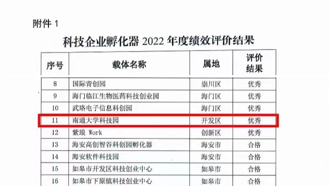 近日,南通市科技局公布科技企业孵化器、众创空间2022年度绩效评价结果。经单位申报、属地推荐、专家评审、实地抽查等程序,mg冰球官网国家大学科技园在科技企业孵化器绩效评价中获评优秀等级。这是mg冰球官网连续第二年获得优秀评级。