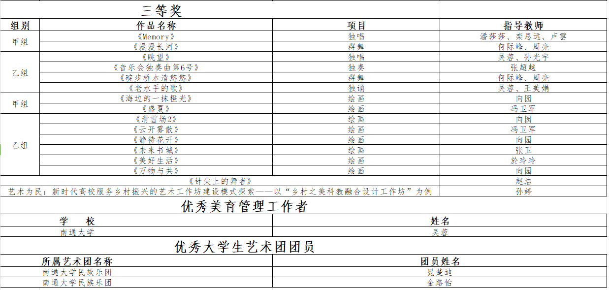 近日,江苏省第七届大学生艺术展演活动评选结果揭晓。mg冰球官网共有37件参赛作品获奖,其中3件作品获特等奖、10件作品获一等奖、8件作品获二等奖、16件作品获三等奖,获奖数创历史新高。此外,艺术学院吴蓉获评优秀美育管理工作者,mg冰球突破试玩民乐团晁楚迪、金路怡获评优秀艺术团成员。艺术作品《美好生活》、小合奏《Danse Macabre, Op.40 》将代表学校参与国赛角逐。备赛期间,校党委常委、副校长吉明明亲切慰问了参赛师生代表。