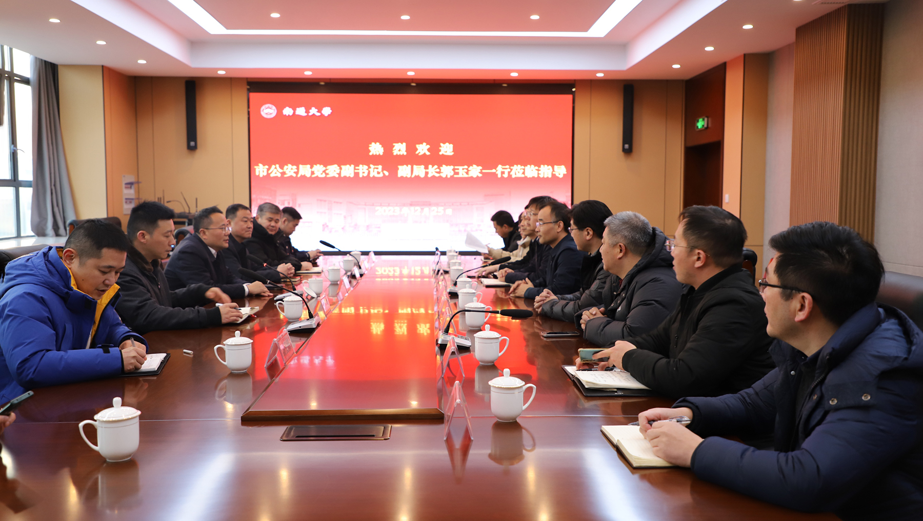 12月25日下午,南通市公安局党委副书记、副局长郭玉家一行来校交流。校党委常委、副校长陆俊杰,校党委常委、保卫部部长朱城出席座谈交流会。