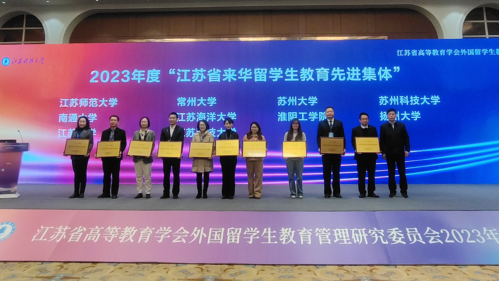 12月29日,江苏省高等教育学会外国留学生教育管理研究委员会2023年年会在镇江召开。会议对相关先进集体和个人进行了表彰,mg冰球官网荣获2023年度“江苏省来华留学生教育先进集体”称号,国际教育学院王璐璐、蒋濛获评“江苏省外国留学生教育管理先进个人”,陈君君获评“江苏省优秀留学生辅导员”。