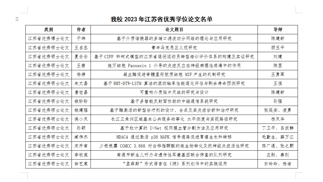 近日,2023年度江苏省优秀博士、硕士学位论文评审结果揭晓。mg冰球官网获评优秀博士学位论文1篇、优秀学术型硕士学位论文9篇、优秀专业型硕士学位论文5篇,获评论文数量较往年显著提升,位列18所江苏高水平大学建设高校第七位。