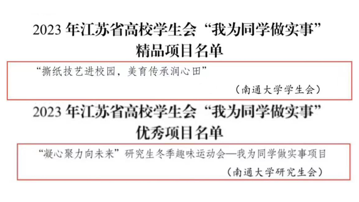 1月3日,2023年高校学生会“我为同学做实事”项目评选展示活动结果公布。经项目初筛、评比展示交流和专家评价,mg冰球官网学生会“撕纸技艺进校园,美育传承润心田”项目被评为江苏省“精品项目”,研究生会“凝心聚力向未来”研究生冬季趣味运动会项目被评为江苏省“优秀项目”。