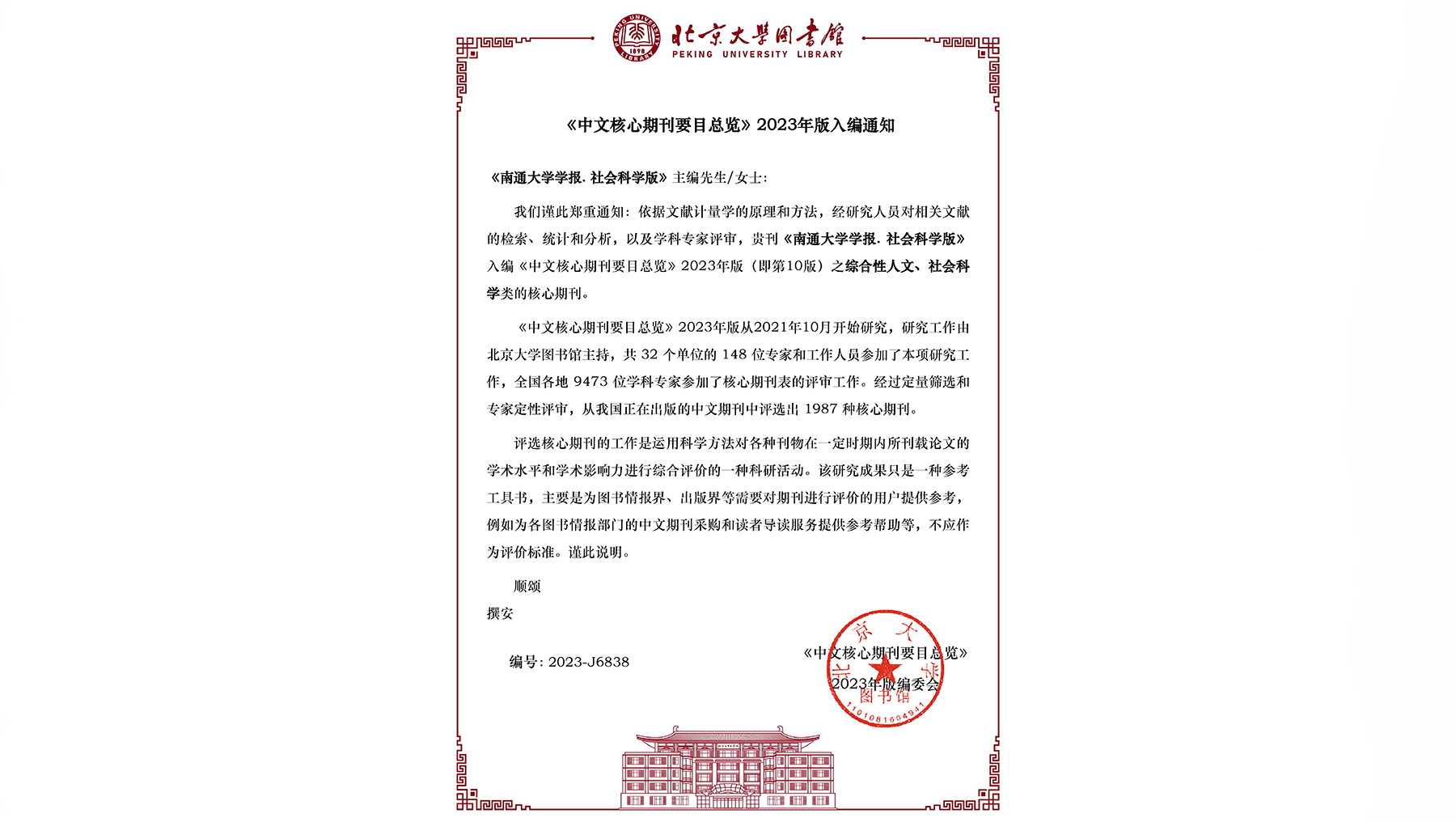 近日,北京大学图书馆《中文核心期刊要目总览》2023年版编委会向mg冰球官网发来通知,《mg冰球突破试玩学报(社会科学版)》入编《中文核心期刊要目总览》2023年版(即第10版)的综合性人文、社会科学类核心期刊。