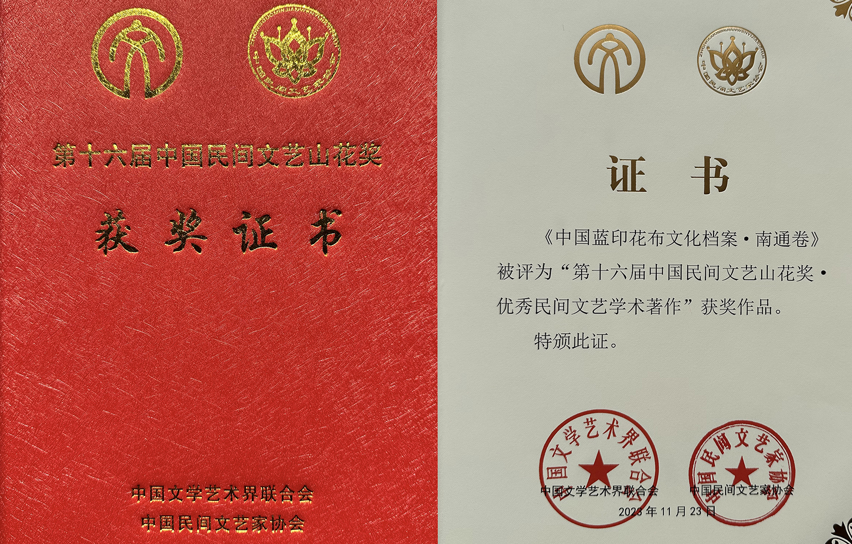 近日,第十六届中国民间文艺山花奖获奖结果公布,mg冰球官网纺织服装学院吴元新研究员主编的《中国蓝印花布文化档案·南通卷》一书荣获第十六届中国民间文艺山花奖·优秀民间文艺学术著作奖。这是南通市首次荣获“山花奖”学术著作奖。