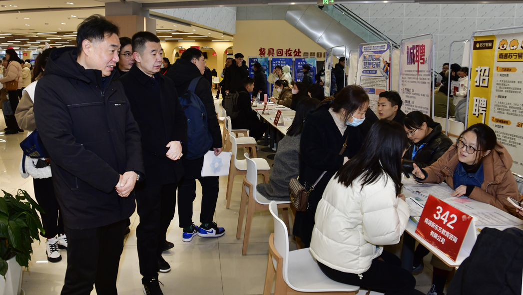 2月5日,“南通爱才 通通回来”2024新春人才交流大市场在mg冰球官网举行。江苏省人才流动服务中心主任李晓军,校党委常委、副校长吉明明深入现场,了解学生与用人单位双选情况。