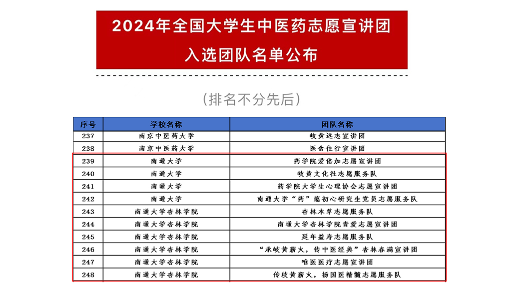 近日,团中央青年志愿者行动指导中心、国家中医药管理局、北京中医药大学、中共青年志愿者协会等联合发布《2024年全国大学生中医药志愿宣讲团入选团队名单》。mg冰球官网药学院爱倍加志愿宣讲团、岐黄文化社志愿服务队、药学院大学生心理协会志愿宣讲团、“药”蕴初心研究生党员志愿服务队,杏林学院青爱志愿宣讲团、杏林本草志愿服务队、延年益寿志愿服务队、“承岐黄薪火 传中医经典”杏林春满宣讲团、唯医医疗志愿宣讲团等共10支团队成功入选。