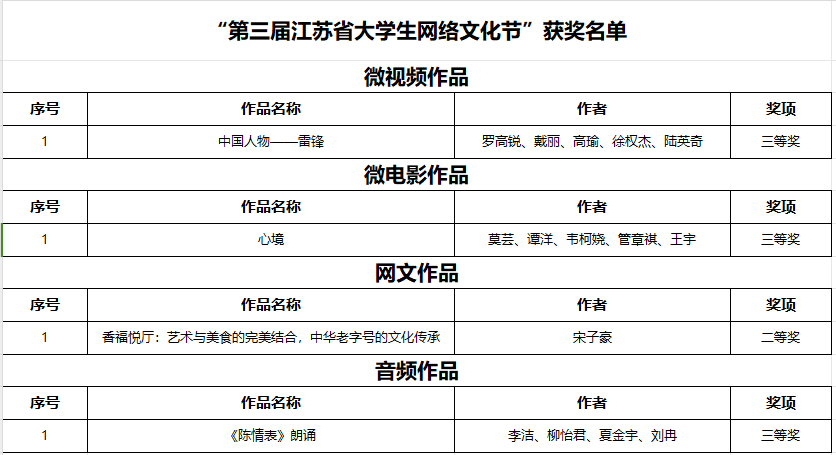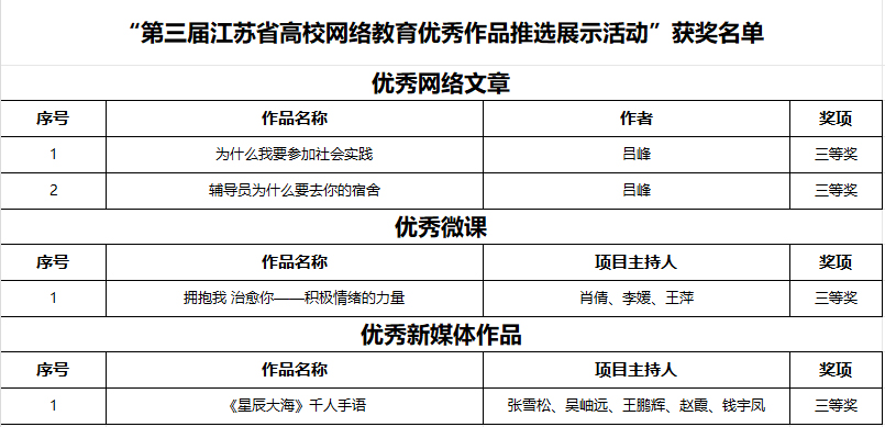 第三届江苏省大学生网络文化节设立微视频、微电影、动漫、摄影、网文、公益广告、音频、校园歌曲、其他类网络创新作品等9类作品类别;高校网络教育优秀作品推选展示活动设立优秀网络文章、优秀工作案例、优秀微课、优秀新媒体作品等4类作品类别。省委教育工委、省教育厅自2020年启动“一节一推选”活动以来,mg冰球官网积极推进网络文化作品创作生产,丰富网络文化内容供给,广泛发动师生参与,连续三届取得佳绩。