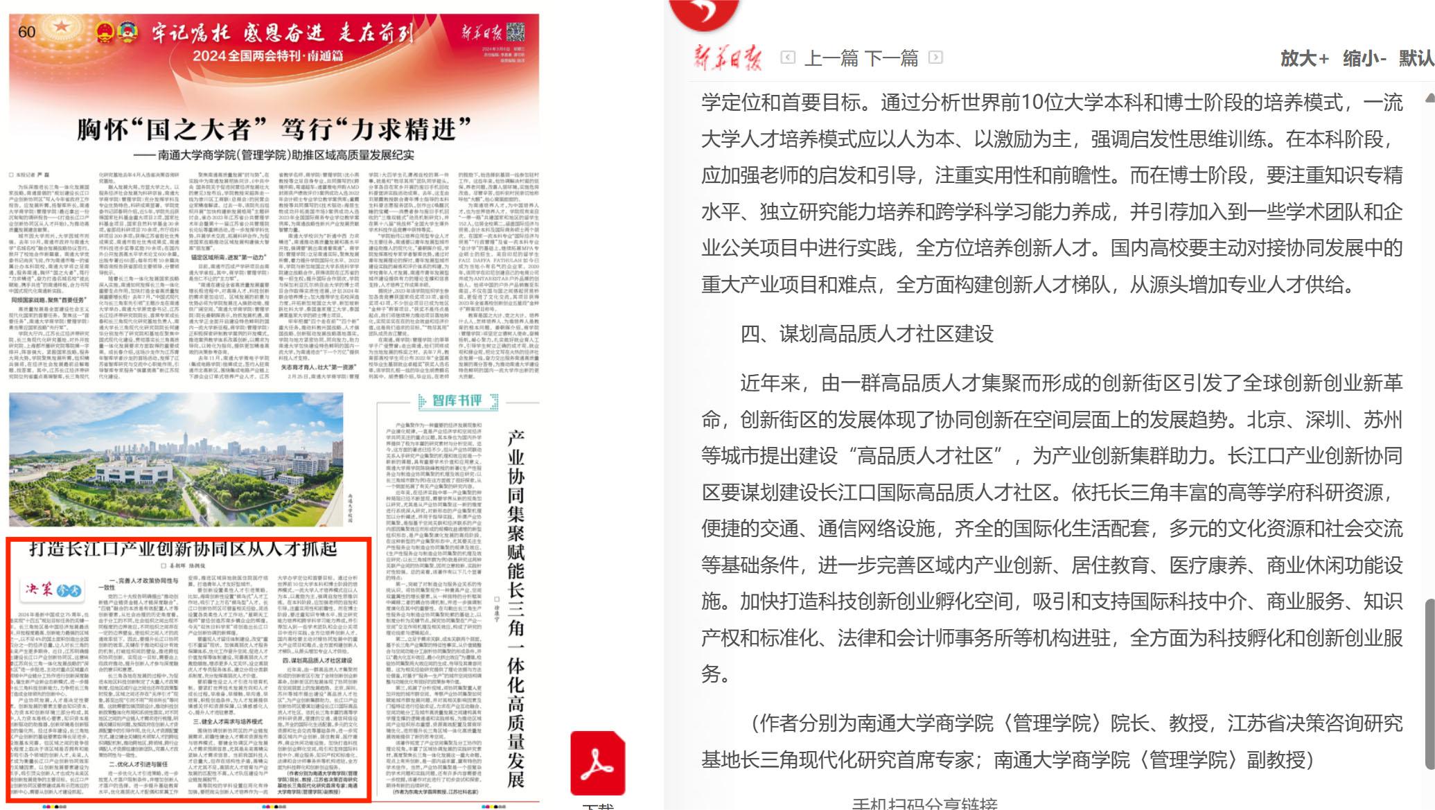 打造长江口产业创新协同区,是推动长三角一体化发展战略向“深水区”进一步挺进的主动棋。在3月6日出版的《新华日报》全国两会特刊上,mg冰球官网商学院(管理学院)院长姜朝晖教授、陆拥俊副教授发表题为《打造长江口产业创新协同区从人才抓起》的决策参考文章。文章中指出,长江口产业创新协同区建设要对重点区域、重点领域中产业链分工协作进行创新深度融合,催生新产业新业态新模式,进一步提升长三角科技创新能力,需要从创新人才建设抓起,要进一步完善人才政策协同性与一致性、优化人才引进与留任、健全人才需求与培养模式、谋划高品质人才社区建设,力争把长三角打造成全球领先的创新中心。