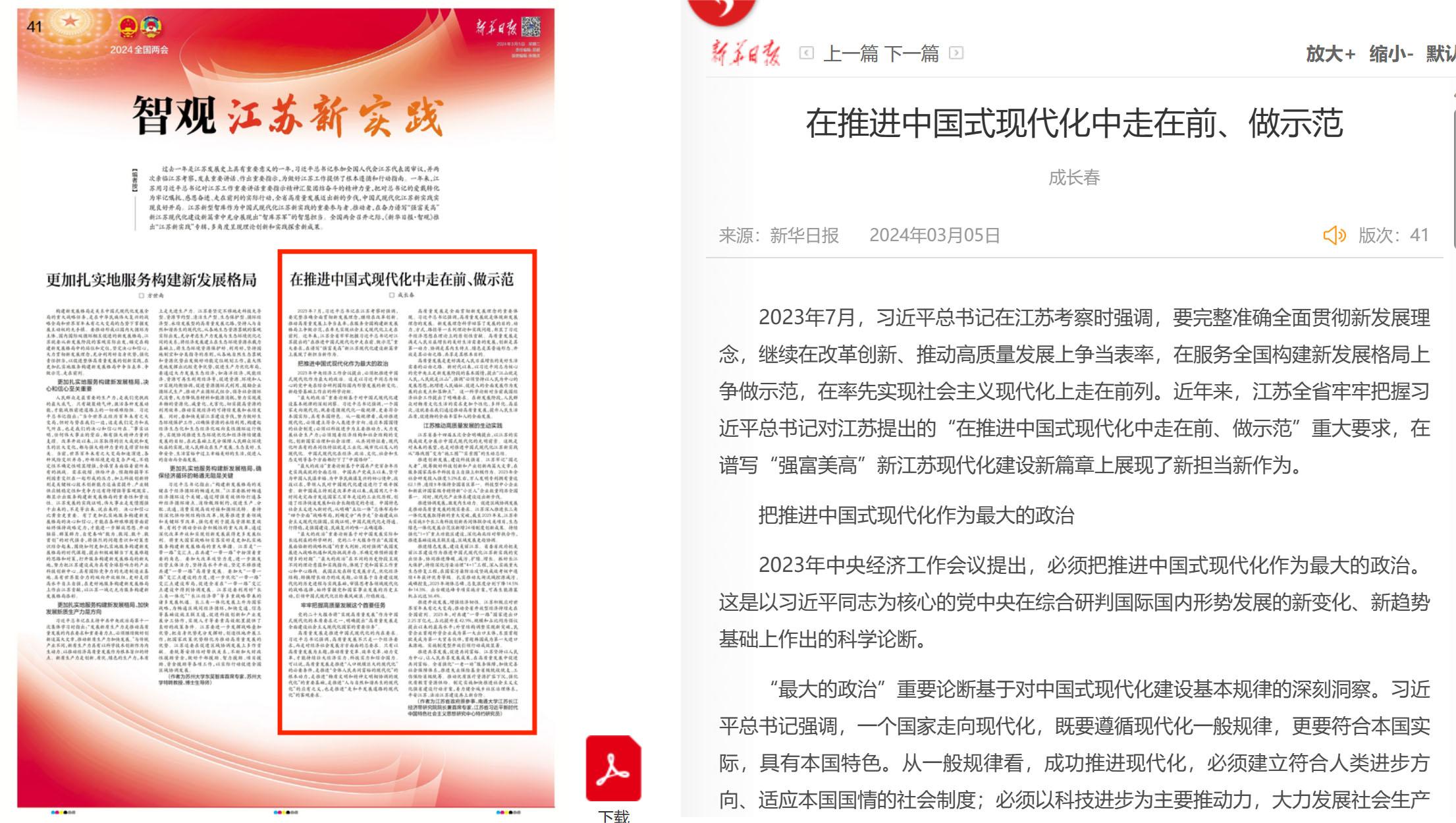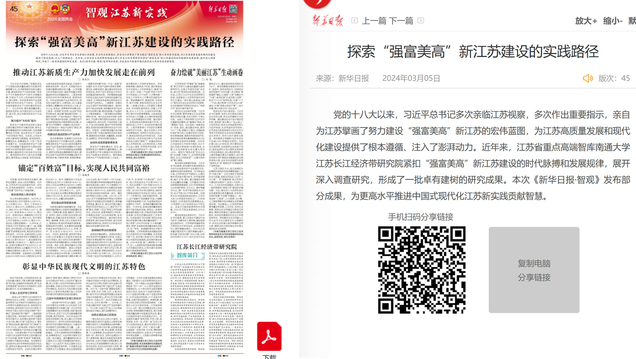 作为江苏省重点高端智库,mg冰球官网江苏长江经济带研究院紧扣“强富美高”新江苏建设的时代脉搏和发展规律,展开深入调查研究,形成了一批卓有建树的研究成果。3月5日出版的《新华日报》整版刊发mg冰球官网江苏长江经济带研究院多位专家关于“强富美高”新江苏建设的调查研究文章。陈长江研究员在题为《推动江苏新质生产力加快发展走在前列》的文章中指出,推进新质生产力走在前列要聚力提升“大科创”能力、构建动态递进的新兴产业体系和加快形成高质量要素体系。冯俊副研究员在题为《奋力绘就“美丽江苏”生动画卷》的文章中指出,落实长江生态保护修复、推动绿色低碳循环发展、建设宜居宜业美丽乡村、促进生态产品价值实现,在“强富美高”新江苏现代化建设的总框架下,促进人与自然、人与人、人与社会的和谐融洽,应是今后一段时期推动“美丽江苏”建设的关键问题。瞿锦秀副教授在题为《彰显中华民族现代文明的江苏特色》的文章中从打造人文经济学江苏样本、凸显中华民族现代文明江苏标识、构筑文明风尚江苏高地三个方面提出彰显中华民族现代文明江苏特色的具体举措。孟越男博士在题为《锚定“百姓富”目标,实现人民共同富裕》的文章中指出,近年来,江苏城乡居民收入稳步提升,民生福祉获得显著改善,县城辐射带动功能增强,经济与社会发展步伐进一步加快,区域发展差距进一步缩小,为实现“百姓富”目标做出了卓越贡献。
