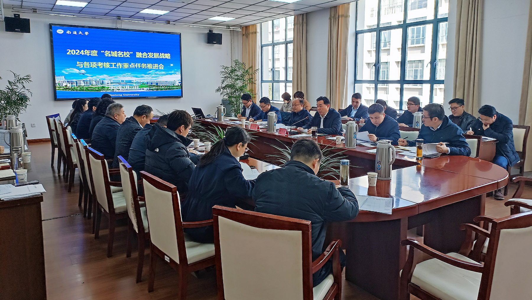 杨宇民指出,2024年是全面贯彻落实校第四次党代会精神的开局之年,是实现“十四五”规划目标任务的关键之年,也是项目化推进“名城名校”融合发展战略的首战之年。2023年,在学校党委行政的坚强领导和全校师生的共同努力下,学校内涵建设的各项指标取得了一定的进步,但与早日建成特色鲜明的国内一流大学的要求还存在较大差距。就更高质量推进2024年各项重点工作任务,他提出三点要求。一是提高政治站位,明确主体责任。在全校上下掀起学习宣传贯彻全国两会精神热潮的背景下,各单位要贯彻落实好党和国家的各项重要决策部署,吃透政策、把好方向,紧扣高质量发展之大局,增强责任之心,勇于担当作为,以时不我待的紧迫感、不进则退的危机感,持续奋斗,推动学校各项事业再上新台阶。二是抢抓发展机遇,精准谋划推进。在全面推进“名城名校”融合发展战略的过程中,要坚持系统观念,统筹谋划全局,将学校中长期发展目标与年度目标任务相结合;坚持“点面任务”结合,统筹好面上工作与重点工作,抓住重点带动面上工作;坚持“资源空间”结合,统筹校外校内资源,优化资源配置,助力学校高质量发展“螺旋式”上升。三是构建协同机制,确保取得实效。各单位要加强市校工作组协同机制,全面推动“名城名校”融合发展战略年度目标任务圆满完成;要加强校内协同机制,围绕高质量发展各大核心指标,全力构建学校全方位发展新格局,为江苏省和南通市高质量发展贡献通大力量。