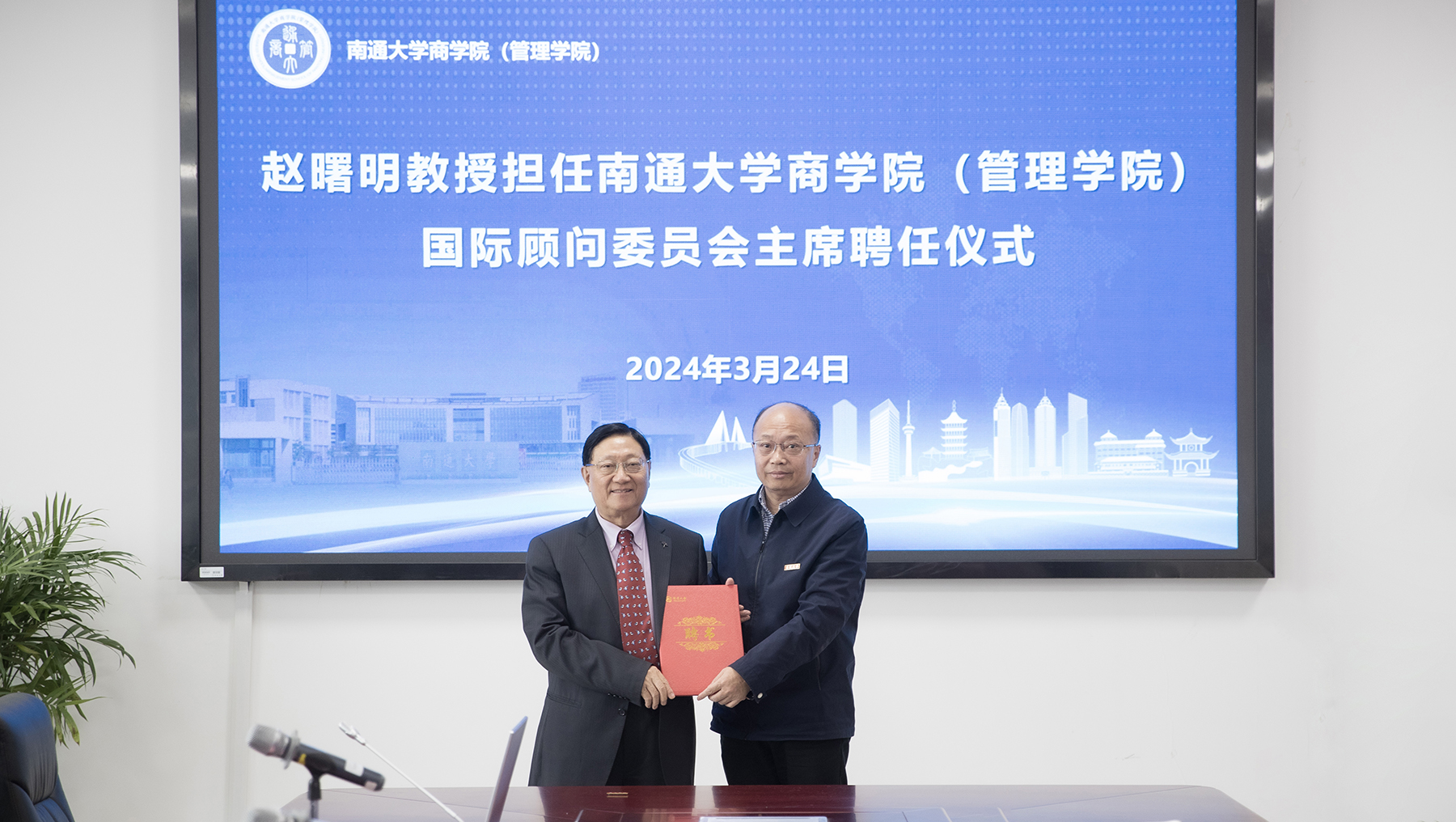 3月24日上午,mg冰球官网聘请南京大学人文资深教授赵曙明担任商学院(管理学院)国际顾问委员会主席。校党委副书记、校长杨宇民为赵曙明教授颁发聘书并佩戴校徽。