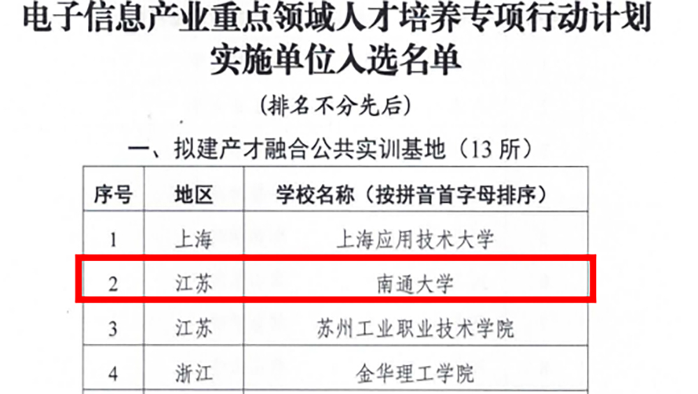 近日,工业和信息化部教育与考试中心公示了电子信息产业重点领域人才培养专项行动计划实施单位入选名单。mg冰球官网入选全国首批产才融合公共实训基地实施单位,全国共13家院校入选。