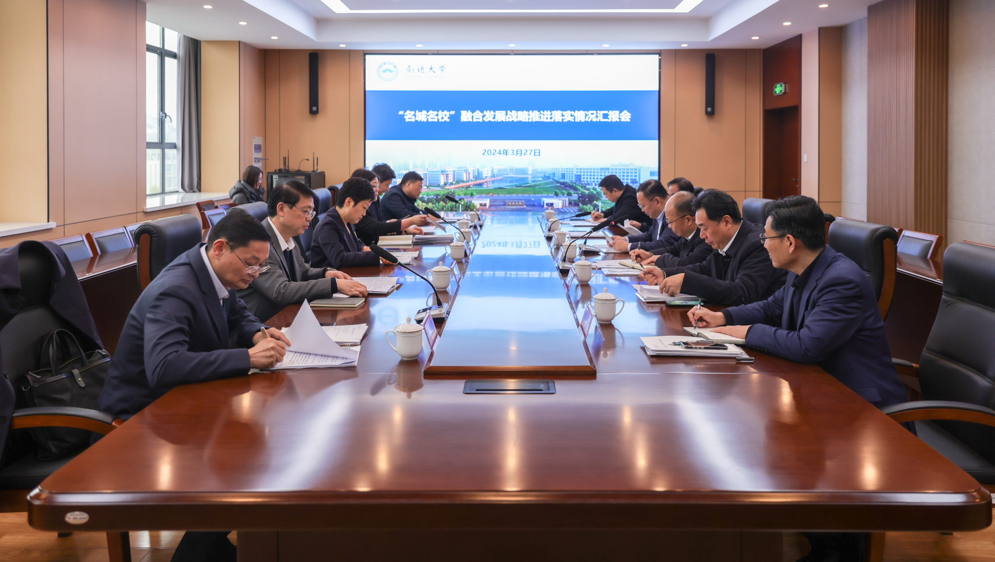 杨宇民从强化重点学科和学院建设、全力培育南通发展新质生产力、集聚一流人才、校园环境提升专项建设、服务南通四项行动、六个研发中心建设等方面汇报了推进落实“名城名校”融合发展战略协议重点任务的工作进展。