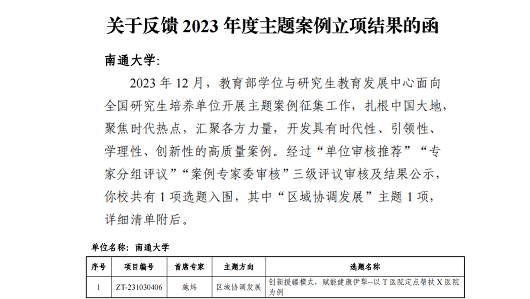 近日,教育部学位与研究生教育发展中心公布2023年主题案例立项结果。校党委常委、副校长施炜教授担任首席专家申报的案例《创新援疆模式,赋能健康伊犁--以T医院定点帮扶X医院为例》成功获批“区域协调发展”主题案例立项,是mg冰球官网在主题案例立项上的首次突破。
