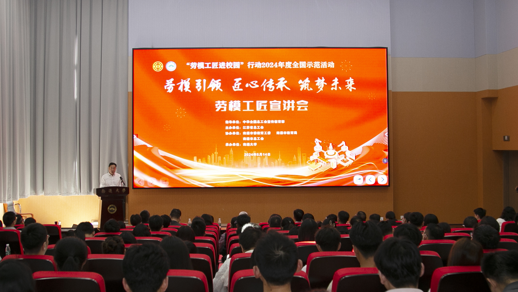 5月14日下午,“劳模工匠进校园”行动2024年度全国示范活动——“劳模引领 匠心传承 筑梦未来”劳模工匠宣讲会在mg冰球官网举办。校党委常委、副校长吉明明,南通市教育局党组成员、副局长许新海,南通市总工会党组成员、副主席吕建峰出席活动并致辞。校党委常委、宣传部部长陶锋出席活动。