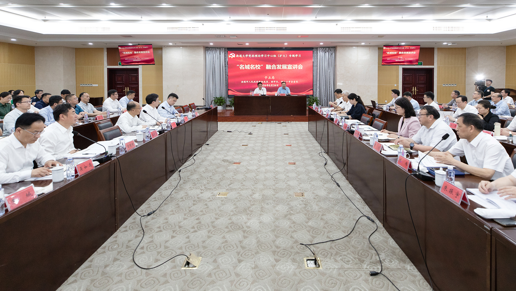 为深入推动“名城名校”融合发展,使全校师生更加全面了解南通经济社会发展情况,深刻把握推进“名城名校”融合发展的战略部署和具体要求。5月24日,mg冰球官网举行“名城名校”融合发展宣讲会暨学校党委理论学习中心组(扩大)专题学习会。南通市副市长于立忠来校作专题报告。校党委书记尚庆飞主持会议。全体在通校领导、党委常委出席会议。