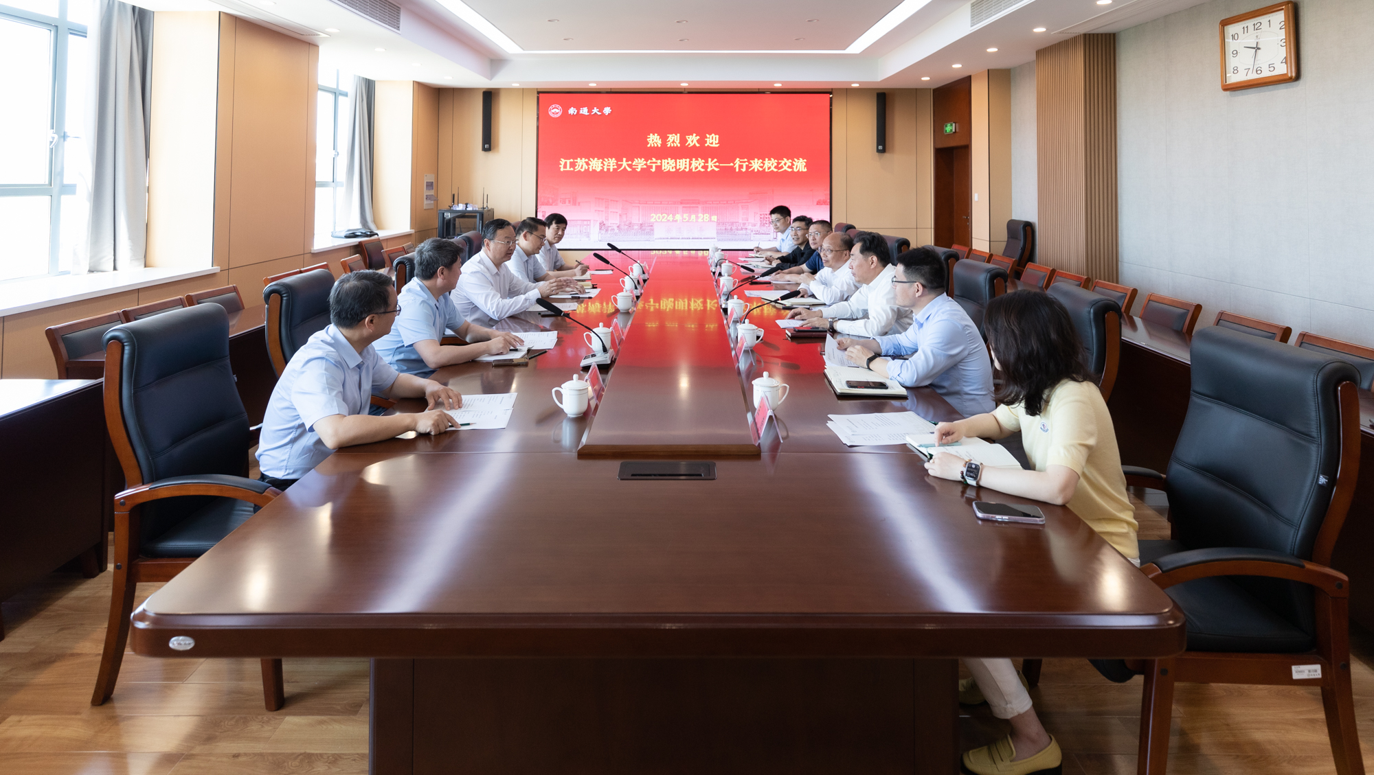 5月28日上午,江苏海洋大学校长宁晓明一行来校调研交流。校党委副书记、校长杨宇民出席座谈会并致辞。校党委常委、副校长吉明明主持会议。